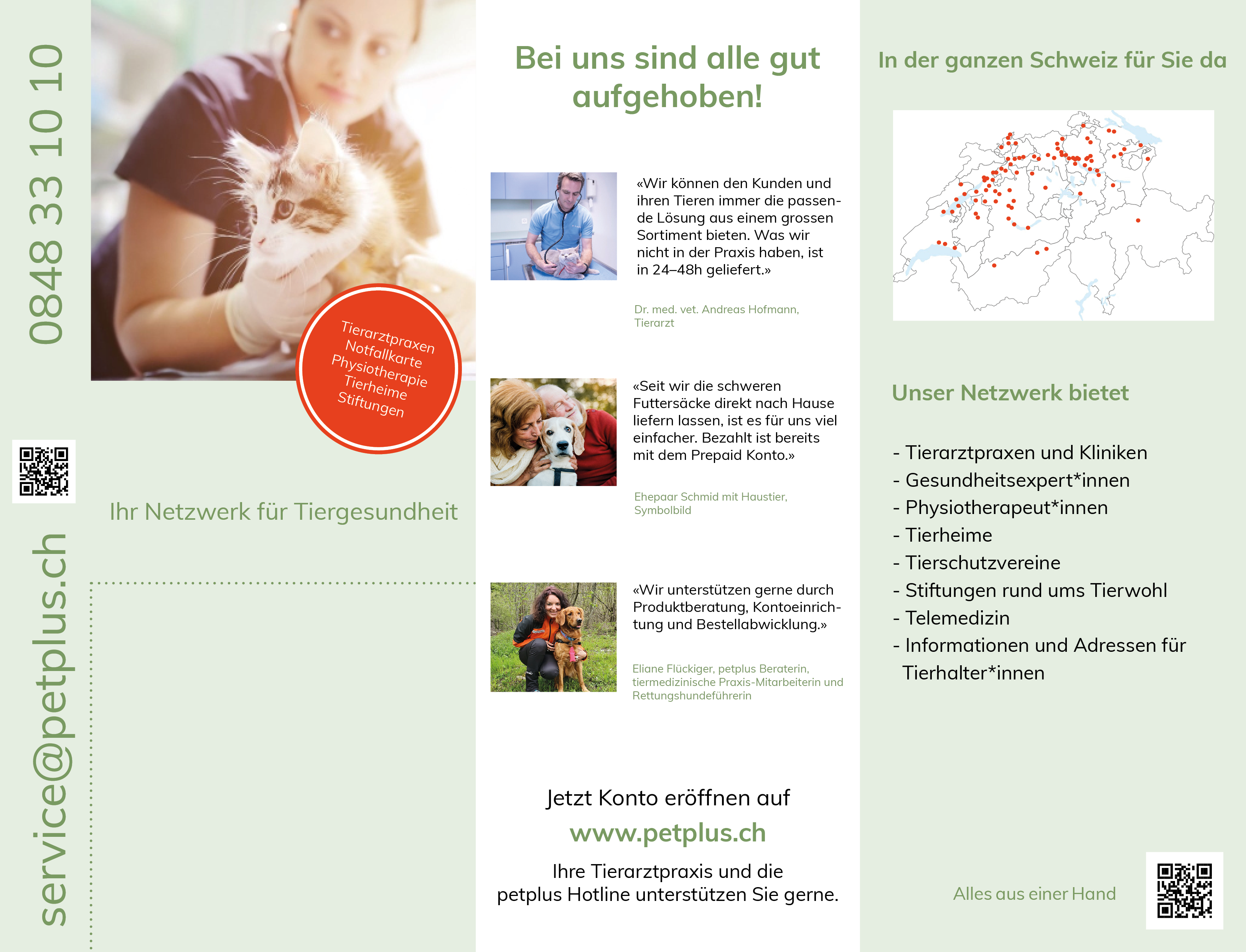 Die vetroup ag arbeitet eng mit den Lieferanten und den Tierarztpraxen/-Kliniken zusammen. Diese intensive Kooperation ermöglicht den Zugang zu wissenschaftlichen Erkenntnissen, Fachwissen von Spezialisten die das Beratungsangebot erweitern. Kunden können sich beim Team von petplus.ch zu gesundheitlichen Themen beraten lassen. Fragen zu Futter und Nahrungsergänzungen werden mit grosser Sorgfalt bearbeitet und zusammen mit dem Tierarzt, sowie den Spezialisten kann eine fundierte Empfehlung abgegeben werden.