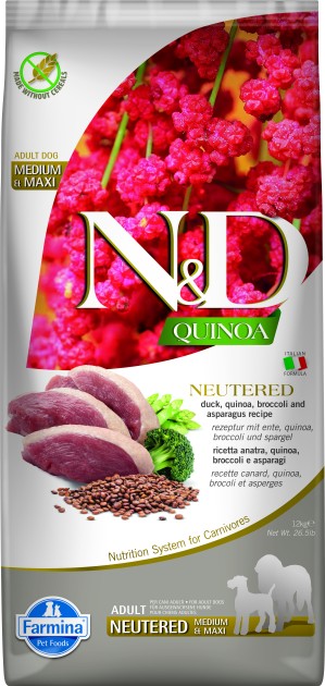 Ente ohne Knochen (20%), dehydriertes Entenprotein (20%), Süsskartoffeln, Rübentrockenschnitzel, Trockenei, Quinoasaat-Extraktionsschrot (8%), Hühnerfett, dehydriertes Heringprotein, Erbsenfaser, Leinsaat, Fischöl (vom Hering), getrockneter Broccoli (2,5%) getrockneter Spargel (2,5%), Fructo-Oligosaccharide, Hefeextrakt (Quelle für Manno-Oligosaccharide), Pulvercellulose, getrocknete Bierhefe, Flohsamen und -schalen, Kalziumsulfat-Dihydrat, Kaliumchlorid, Natriumchlorid, Glukosamin, Chondroitinsulfat.